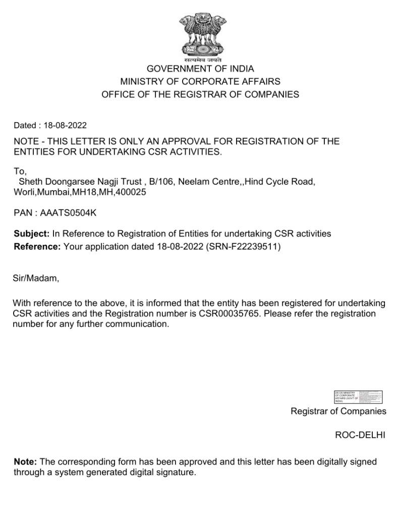 - Cheque can be drawn in favour of “Sheth Doongarshi Nagji Trust”